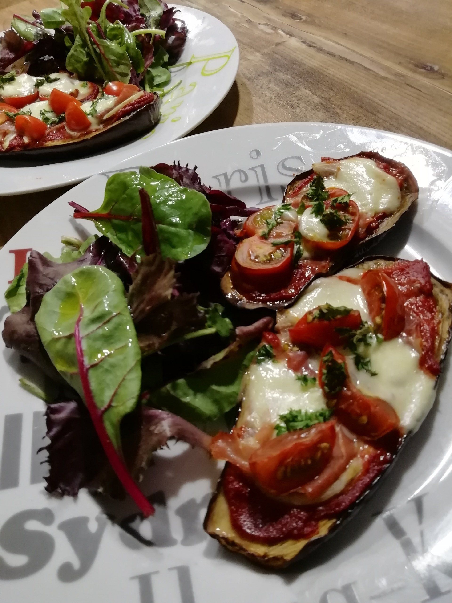 Une recette vraiment vraiment à tester ! C'est très simple, rapide et tellement délicieux, foncez ! Ingrédients : pour 2 personnes, une belle aubergine, un peu d’huile d’olive, du concentré de tomates, un oignon, un jambon de Bayonne, quelques tomates cerises, et quelques petites boules de mozzarella 1- découpez l’aubergine, dans sa longueur, en tranches épaisses (vous en ferez normalement 4-5) 2- badigeonnez chaque tranche dessous dessus d’un peu d’huile d’olive 3- passez au four (préchauffé au préalable) 15 min à 180°, en retournant les tranches au bout de 7-8 minutes 4- sortez vos tranches, et garnissez : une couche de concentré de tomates, quelques oignons émincés très finement, une tranche de jambon de Bayonne, quelques tomates cerises coupées en 2, et quelques petites boules de mozzarella coupées en 2, des herbes fraîches si vous en avez (persil, coriandre, ciboulette...) 5- repassez au four 10 min à 180° 6-servez avec une salade verte par exemple Variante : vous pouvez remplacer le jambon de Bayonne par du bacon et de la viande de grison pour un ensemble encore plus léger !